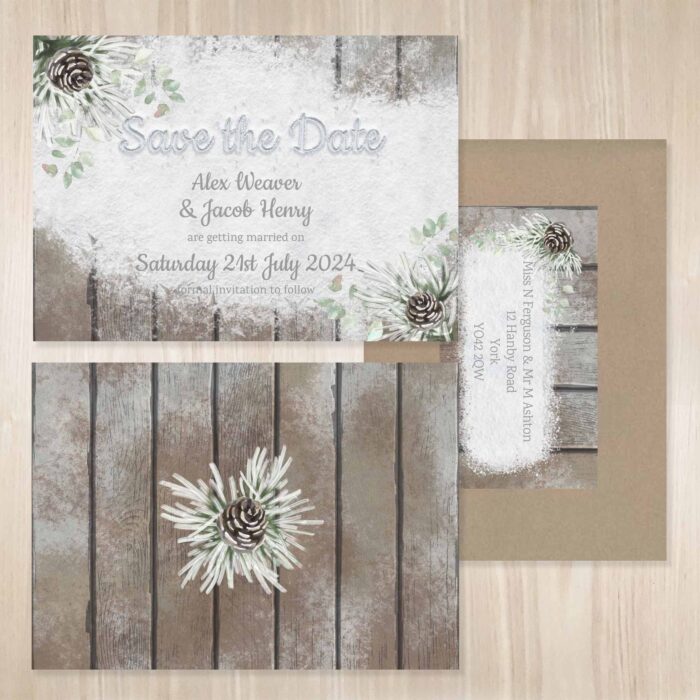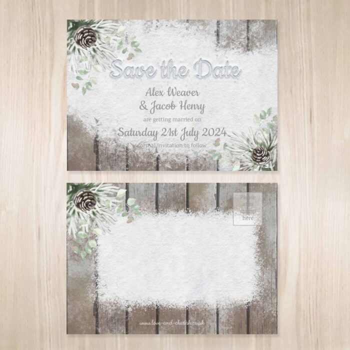 The Save the Dates with envelopes are A6 size and are printed on high quality 300gsm textured card. They will have your names and the date of your wedding on one side, with the theme design on the reverse. They come with rustic brown kraft paper envelopes.