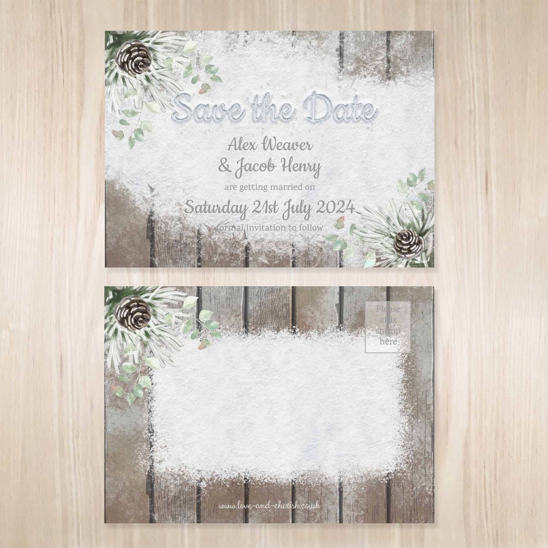 The Save the Date Postcards are A6 size and are printed on high quality 300gsm textured card. They will have your names and the date of your wedding on one side and a blank space for you to write your guests’ names and addresses on the reverse, with a space for a stamp.