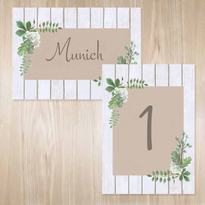 Displaying table names or numbers helps your guests to know which table is theirs. They are printed with the name or number of the table on both sides of the card, so everyone will know where to go! Table numbers can be written either in numeric form (1, 2, 3) or word form (One, Two, Three). Please type the names or numbers of each table in the space below, exactly as you want them to appear on the cards.
